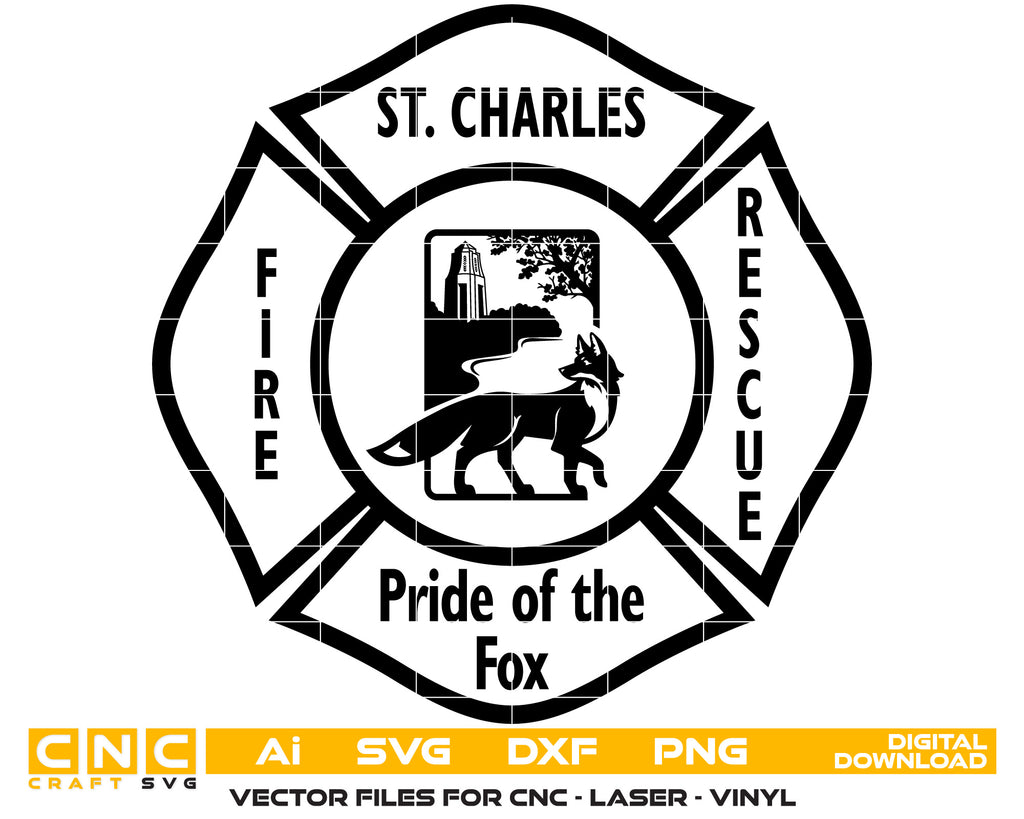 Celebrate service and tradition with the St. Charles Fire Rescue Pride of the Fox Logo in a clean, high-quality vector format. Perfect for crafting projects, firefighter gifts, custom signage, or apparel using Cricut, Silhouette, or laser engraving machines. Ideal for first responder-themed decor and memorabilia.