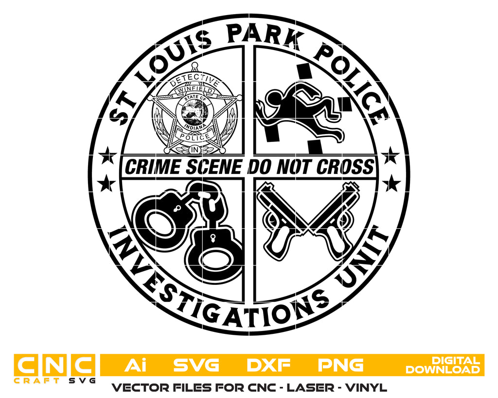 The St. Louis Park Police Criminal Investigations Coin SVG showcases the professionalism, dedication, and investigative excellence of the St. Louis Park Police Department CID Unit. Designed in high-quality scalable vector format, this challenge-coin style emblem is ideal for CNC cutting, laser engraving, vinyl decals, apparel, signage, plaques, and collectible projects. Perfect for law enforcement supporters, detectives, designers, and collectors, it maintains crisp, sharp detailing on metal, wood, fabric, or acrylic, proudly honoring the St. Louis Park Police Criminal Investigations Division.