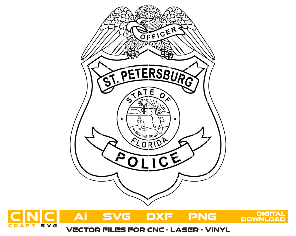 Designed to represent frontline service and professional duty, the St. Petersburg Police Officer Badge SVG is ideal for department recognition, uniform graphics, and collector projects. This precision-crafted vector badge supports CNC cutting, laser engraving, vinyl decals, plaques, and signage with sharp, dependable results. Built for flexibility and scale, it performs cleanly on metal, wood, acrylic, leather, and fabric, making it a reliable choice for law enforcement branding and police memorabilia connected to St. Petersburg.