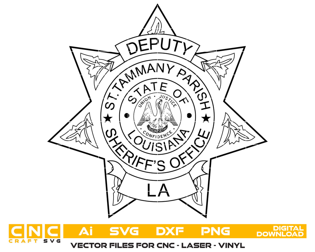 Celebrate the authority, service, and professionalism of Louisiana law enforcement with this St. Tammany Parish Sheriff Badge SVG — a crisp, high-quality vector design ideal for crafting, printing, engraving, and tribute projects.