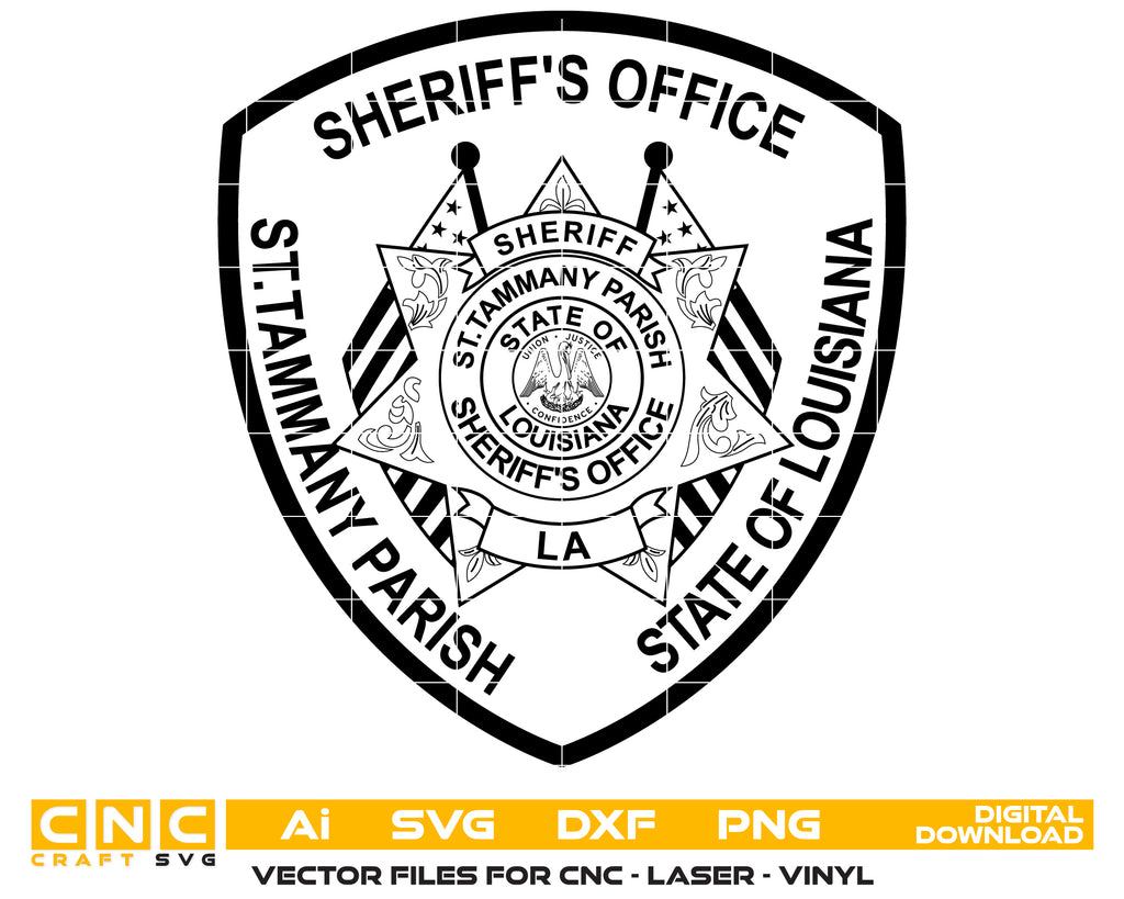 Celebrate the dedication and service of Louisiana law enforcement with this St. Tammany Parish Sheriff’s Office Patch SVG — a high-quality, detailed vector design perfect for crafting, printing, engraving, and tribute projects.