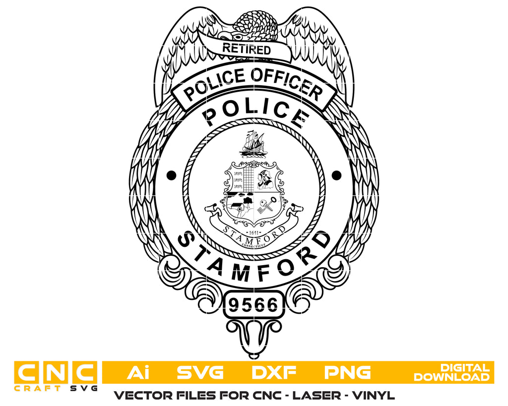 Honor the tradition and design of Connecticut law enforcement with this Stamford Police Officer Badge SVG — a clean, highly detailed vector replica ideal for crafting, décor, engraving, and collector-style artwork.