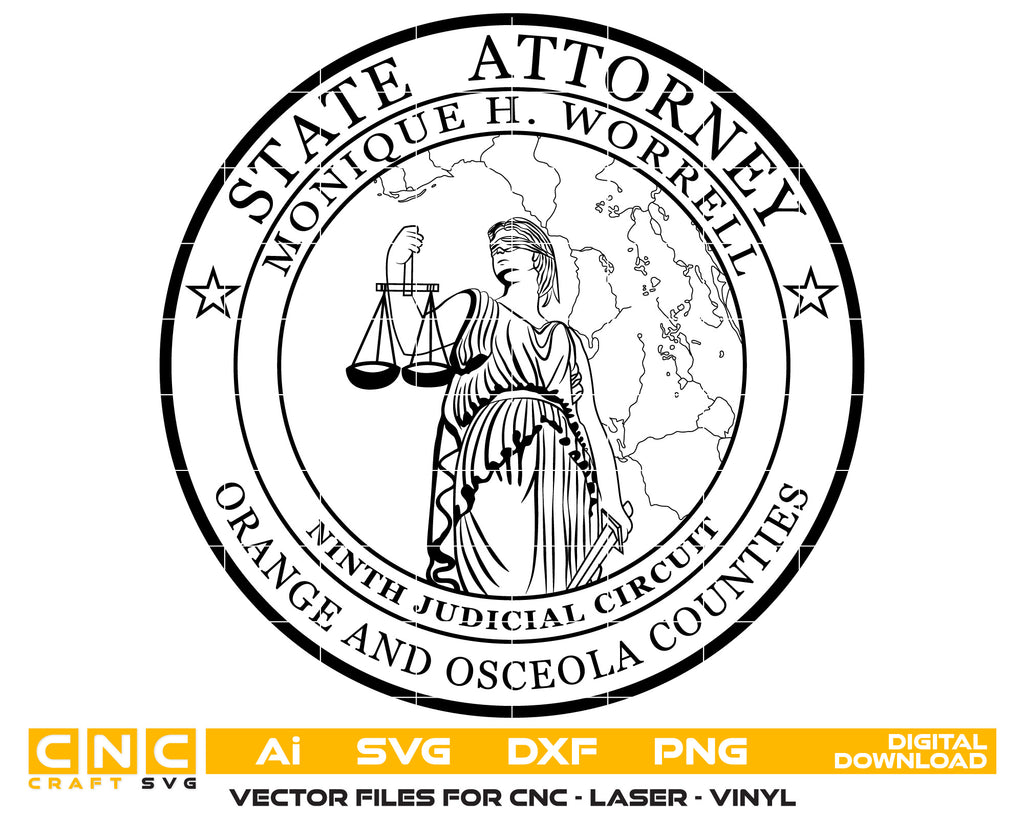 Download the official State Attorney Orange and Osceola Counties Logo as a high-quality vector file, perfect for professional and creative projects. Ideal for use with Cricut, Silhouette, Glowforge, laser cutters, and vinyl machines, this clean and precise design is great for civic signage, apparel, decals, and promotional materials.