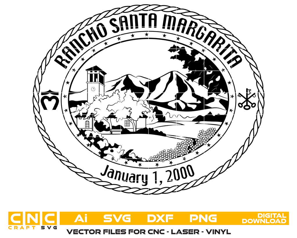 Download a professionally crafted Rancho Santa Margarita City Seal SVG featuring sharp detailing, smooth lines, and perfect scalability. This premium vector design is ideal for Cricut, Silhouette, CNC cutting, laser engraving, vinyl decals, signage, plaques, apparel, and both digital and print projects.