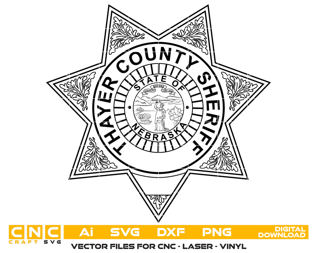 Add a professional, detailed graphic to your crafting or display project with this Thayer County Sheriff Badge SVG, inspired by the classic sheriff star associated with Thayer County, Nebraska.