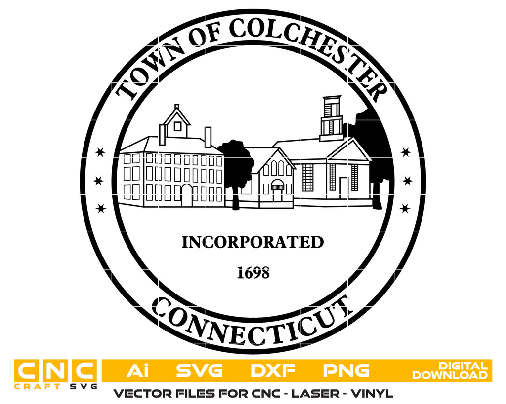 The Town of Colchester Seal SVG is a detailed municipal emblem recreated in precise vector format. Perfect for CNC cutting, laser engraving, vinyl decals, government signage, commemorative plaques, and town branding, this seal ensures scalable accuracy. With sharp vector lines, it delivers clean results on wood, metal, fabric, and acrylic. A strong choice for civic recognition, town memorabilia, and custom woodworking projects, this file combines authenticity with professional quality.