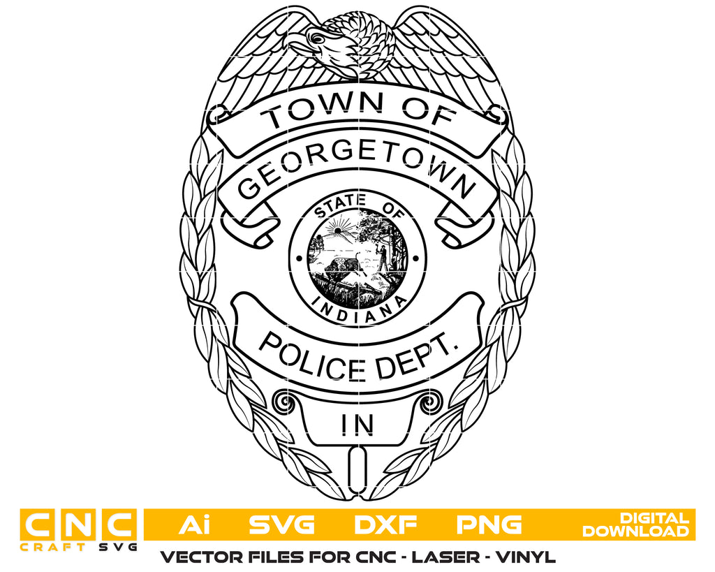 Create professional-quality law enforcement designs with this Town of Georgetown Police Department Badge SVG, a clean and detailed vector badge inspired by the Georgetown Police Department in Indiana. Designed for accuracy and clarity, this badge artwork is ideal for high-quality cutting, engraving, and printing applications.