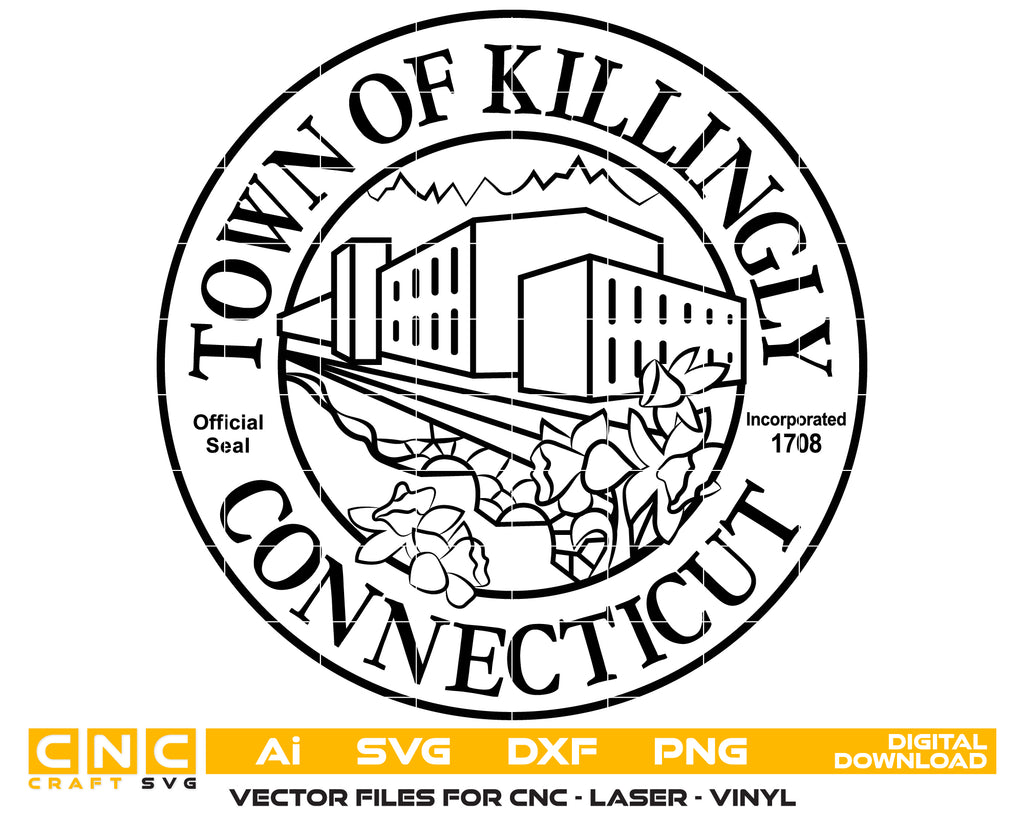 Town of Killingly Seal SVG – official Connecticut municipal emblem for CNC, engraving, plaques & signage. Includes SVG, DXF, AI, PNG formats.