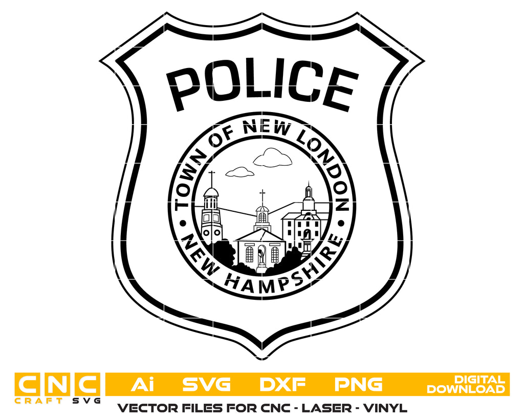 Create professional, law-enforcement–themed designs with this Town of New London Police Badge SVG, a detailed vector illustration inspired by the official police badge used in New London, New Hampshire. Perfect for crafting, printing, engraving, apparel, and commemorative police projects.