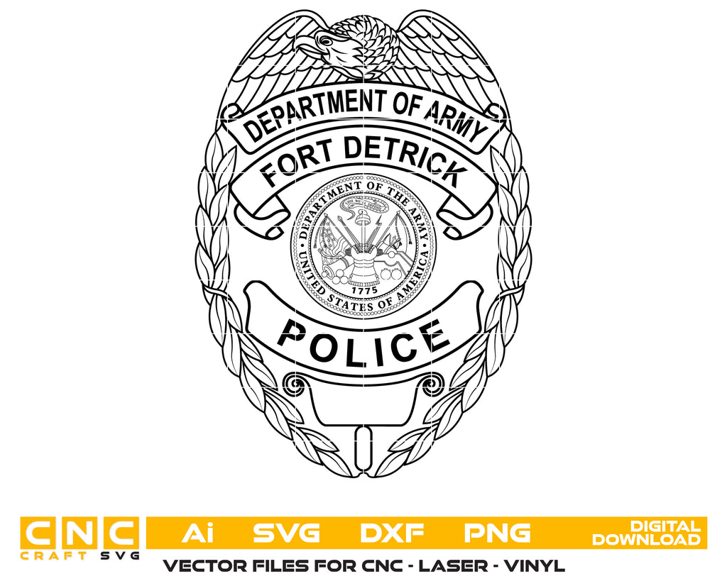 Get a high-quality US Army Fort Detrick Police Badge in clean, detailed vector format — ideal for engraving, printing, decals, apparel, CNC, and laser projects. This professional design captures authentic detailing with smooth, precise vector lines that scale perfectly for any use.