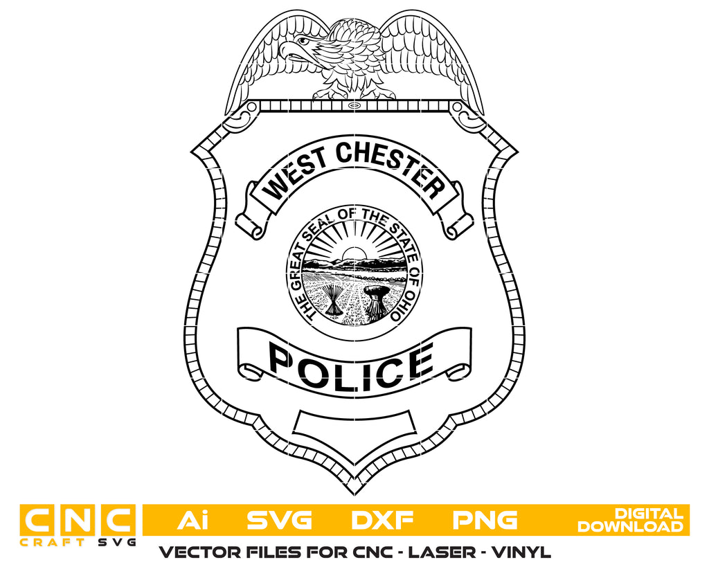 Honor Ohio law enforcement with this West Chester Police Badge SVG. Professionally crafted in scalable vector format, this badge is ideal for CNC cutting, laser engraving, apparel printing, plaques, signage, decals, and collectible projects. Clean vector lines ensure flawless, professional-quality results across wood, acrylic, fabric, or metal.