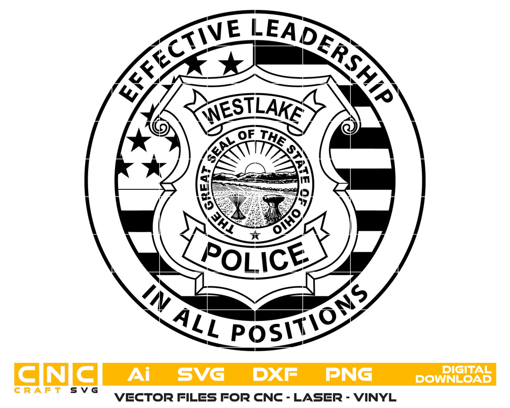 Showcase professionalism with this Westlake Police Effective Leadership In All Positions Badge SVG. Expertly designed in scalable vector format, this official Ohio police badge emblem is perfect for CNC cutting, laser engraving, vinyl decals, apparel printing, plaques, signage, and woodworking projects. With sharp detailing and crisp vector lines, it ensures accurate, professional-quality results on wood, acrylic, fabric, or metal. Ideal for law enforcement plaques, department signage, collectible memorabilia, and custom décor. Fully compatible with Cricut, Silhouette, CNC machines, and laser engravers, this Westlake Police Badge design is available for instant download.