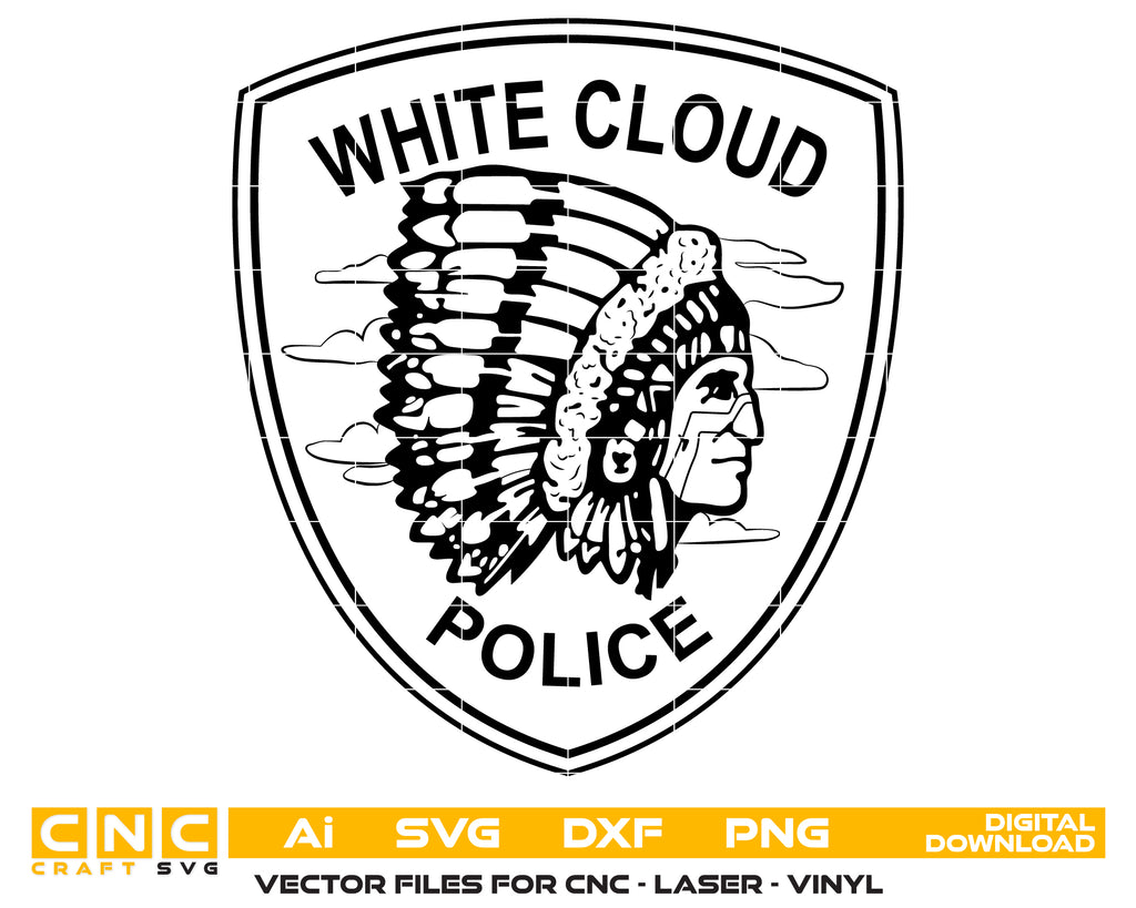 Show appreciation for community law enforcement with this White Cloud Police Patch SVG — a crisp, high-quality vector design perfect for crafting, printing, engraving, and tribute artwork.