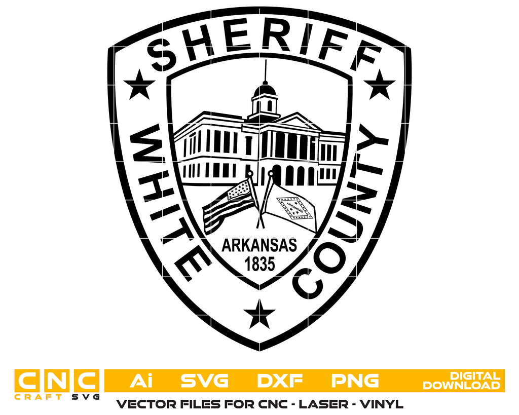 Create professional-quality law enforcement designs with this White County, Arkansas Sheriff Patch SVG, a clean and detailed vector patch inspired by the White County Sheriff’s Office in Arkansas. Designed for accuracy and clarity, this patch artwork is ideal for high-quality cutting, engraving, and printing applications. Perfect for plaques, decals, uniforms, signage, and collectible sheriff patches.