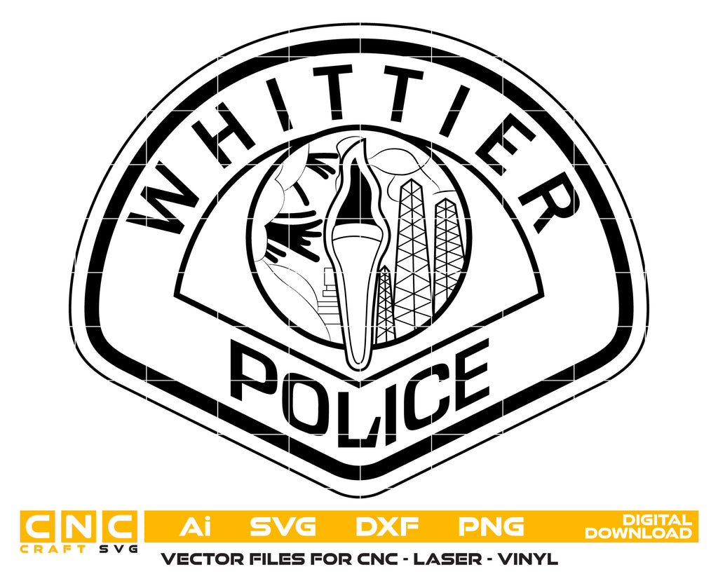The Whittier Police Patch SVG is a high-quality vector emblem representing the Whittier Police Department in California. Perfect for CNC cutting, laser engraving, vinyl decals, apparel printing, signage, and collector displays, this scalable artwork preserves crisp detailing on metal, wood, acrylic, or fabric. Ideal for law enforcement enthusiasts, graphic designers, departments, and collectors seeking a professional California police patch vector.