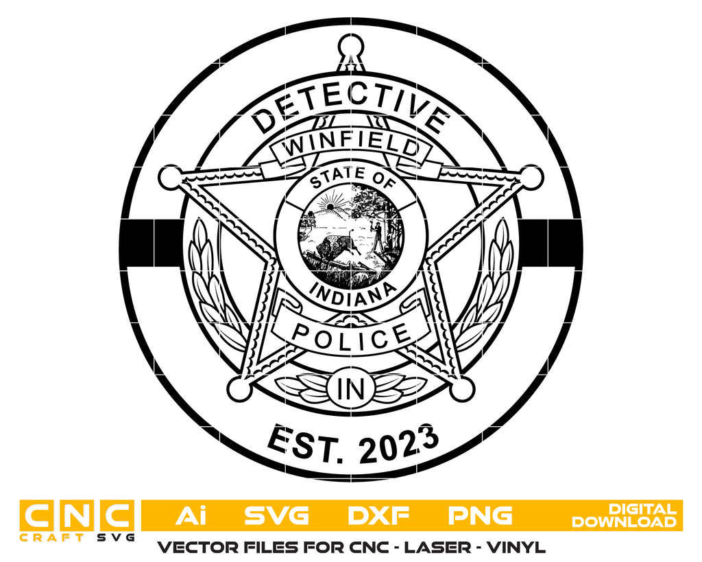 Honor the professionalism, integrity, and investigative service of law enforcement with this Winfield Indiana Police Detective Badge SVG — a crisp, high-quality vector design perfect for crafting, printing, engraving, and commemorative artwork.