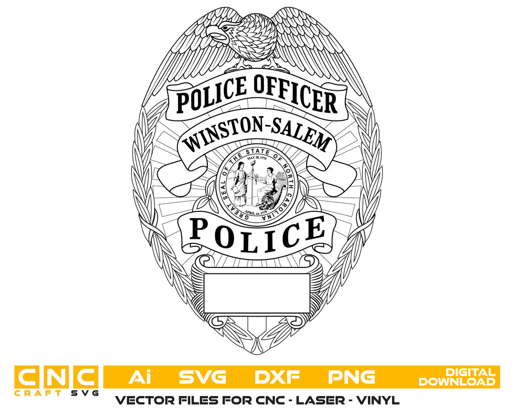 Download a professionally crafted Winston-Salem Police Officer Badge SVG, designed with clean vector lines and crisp details for perfect scalability. Ideal for Cricut, Silhouette, CNC cutting, laser engraving, vinyl decals, apparel printing, and police memorabilia projects — ensuring premium precision for both digital and print use.