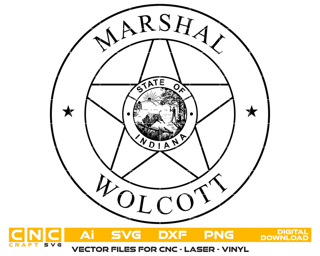 Create professional-quality law enforcement designs with this Wolcott Marshal Badge SVG, a clean and detailed vector badge inspired by the Wolcott Marshal’s Office in Indiana. Designed for accuracy and clarity, this badge artwork is ideal for high-quality cutting, engraving, and printing applications.
