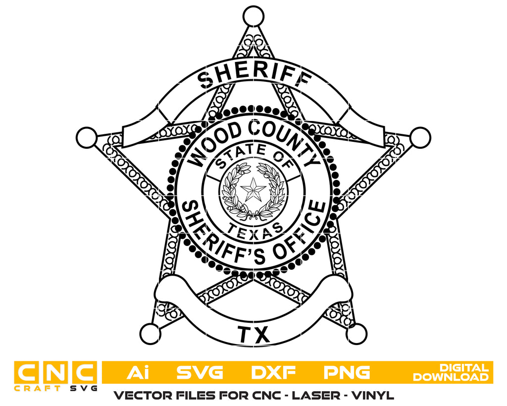 Honor the tradition and service of Texas law enforcement with this Wood County Texas Sheriff Badge SVG — a crisp, high-detail vector badge perfect for crafting, printing, engraving, and collectible display projects.