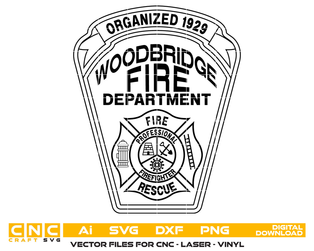 Create clean, professional-quality designs with this Woodbridge Fire Department Badge SVG, a detailed vector illustration inspired by the historic badge used by the Woodbridge Fire Department, established in 1929. Perfect for crafting, engraving, printing, apparel, and commemorative firefighter projects.